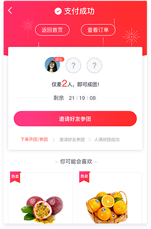 拼团系统可一键分享邀请海量好友参与团购,可快速引流降低库存积压。